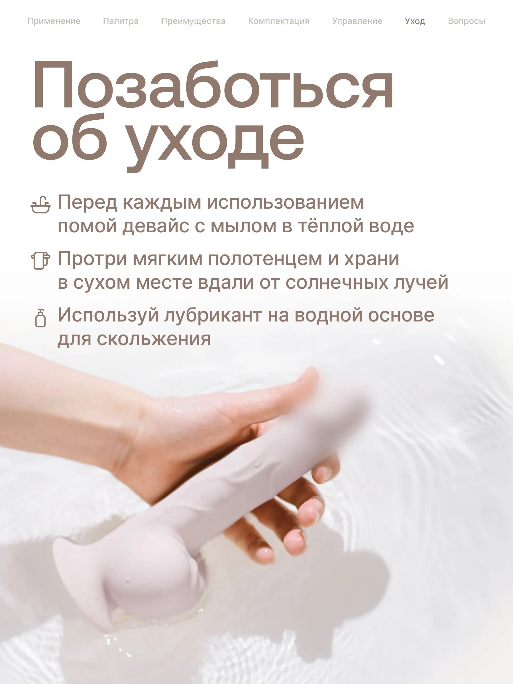 После использования вымойте устройство проточной водой, а для более тщательной очистки используйте жидкое мыло или специальные средства для мытья секс-игрушек. Просушите вибратор полотенцем или мягкой тряпкой или дождаться его полного высыхания, а затем убрать в сухое место вдали от солнечных лучей.