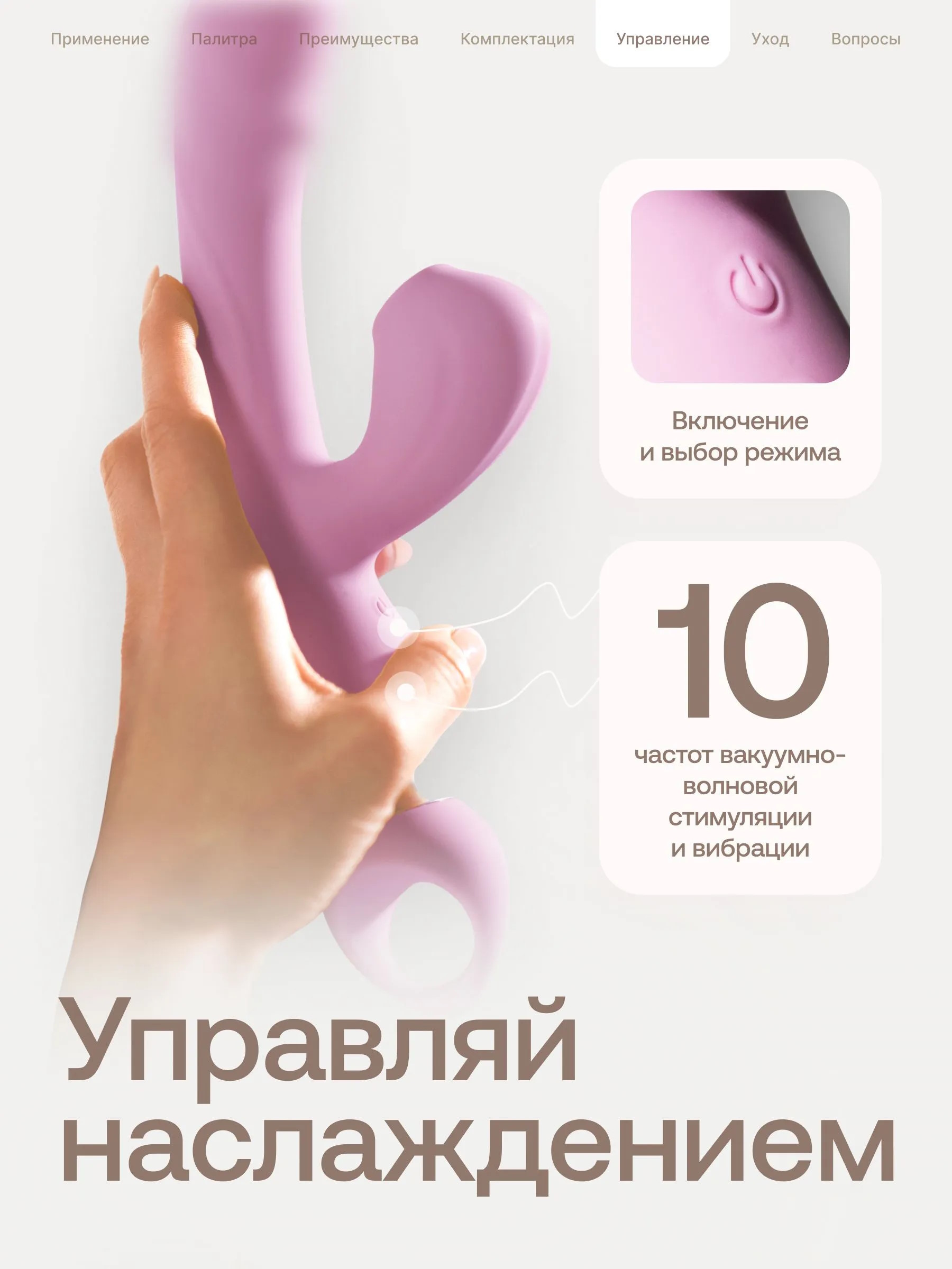 Разместите устройство на место воздействия, включите его и начните плавно увеличивать скорость стимуляции. Выберите комфортный для вас режим работы: начните с низкого уровня мощности, постепенно увеличивая его до комфортного для вас уровня.