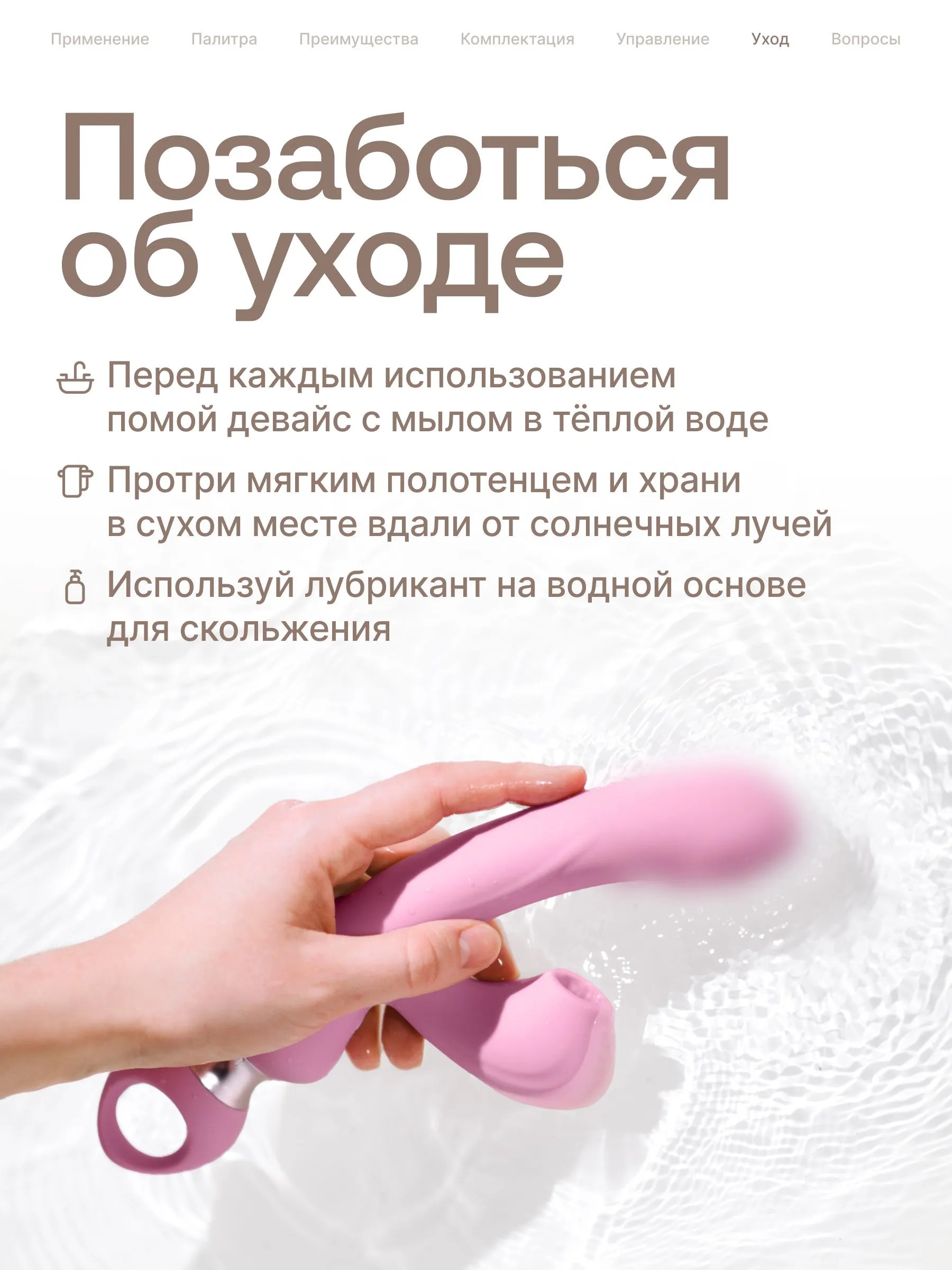 После использования вымойте устройство проточной водой, а для более тщательной очистки используйте жидкое мыло или специальные средства для мытья секс-игрушек. Просушите вибратор полотенцем или мягкой тряпкой или дождаться его полного высыхания, а затем убрать в сухое место вдали от солнечных лучей.